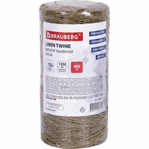 BRAUBERG Шпагат льняной банковский , диаметр 1,5 мм, длина 400 м, линейная плотность 1250 текс, 600115