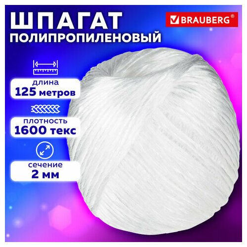 Шпагат полипропиленовый, длина 125 м, диаметр 2 мм, линейная плотность 1600 текс, BRAUBERG, 600398, 2 штуки