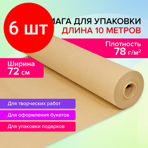 Комплект 6 шт, Крафт-бумага в рулоне, 720 мм x 10 м, плотность 78 г/м2, Марка А (Коммунар), BRAUBERG, 440183