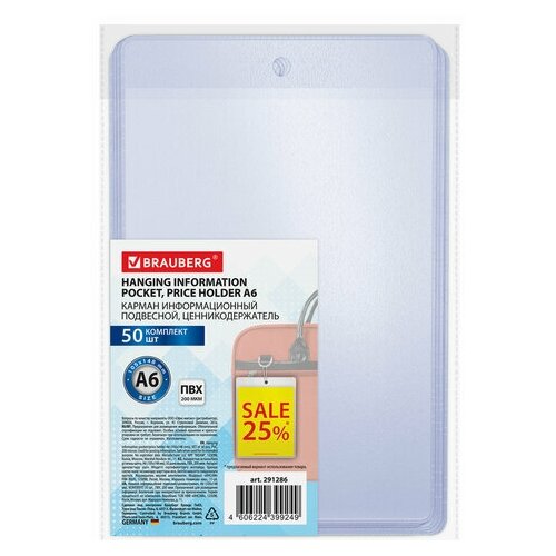 Карман информационный подвесной ценникодержатель А6 комплект 50 ПВХ BRAUBERG, 1 шт