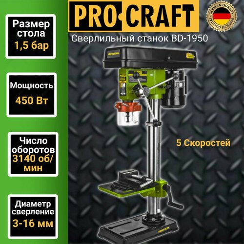 Сверлильный станок Procraft BD-1950, 5 скоростей, патрон 16мм, 3140об/мин, 450Вт
