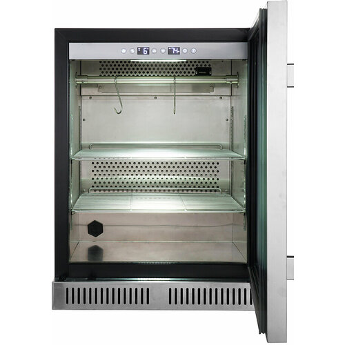 Age изготовлены из нержавеющей стали, а дверца из ударопрочного закаленного стекла, благодаря чему можно наблюдать за процессом. Уникальная система вентиляции позволяет поддерживать оптимальный микроклимат, который не допускает размножения бактерий и микробов, а ферменты, присутствующие в мясе, активизируют химические процессы, которые разрушают мышечные волокна, делая мясо более нежным и позволяют сформировать вкусовой «букет» и аромат. При этом мясо созревает с минимальными потерями в весе, лишь 8% за 4 недели. Особенности Встроенный увлажнитель воздуха в камере Точная регулировка влажности Точная регулировка температуры Низкие массовые потери за счет циркуляции влаги внутри шкафа: - при выдержке в говядина теряет около 7-9% в течение 4 недель -