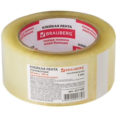 BRAUBERG Клейкая лента упаковочная, 48 мм х 100 м, прозрачная, толщина 45 микрон, brauberg, 221109