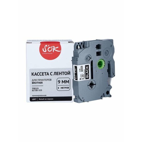 Кассета с лентой TZE-325 для Brother PT-E550WVP, PT-H110, PT-P700, PT-E110VP S'OK белый на черном, 9мм/8м, наклейка