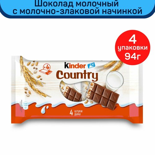 Шоколад молочный Kinder Country с молочно-злаковой начинкой, 4шт. по 94г.