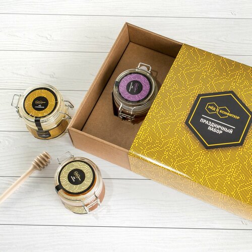 Подарочный набор "Люкс желтый" мёд липовый, расторопшевый, с прополисом бугель и ложечка медовая, Мед и Конфитюр