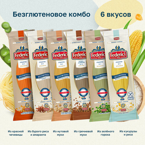Ассорти безглютеновых спагетти Federici "Безглютеновое комбо", 6 вкусов: гороховые, гречневые, рисовые, нутовые, из красной чечевицы, из киноа и амаранта