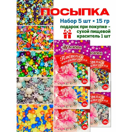 Посыпка кондитерская шарики, драже рисовое в глазури, украшение для торта, выпечки, куличей 5 пакетов по 15 г