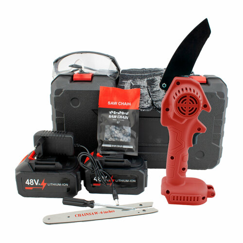 Цепная аккумуляторная пила (красная), 2шт АКБ и ЗУ в комплекте + доп комплектация