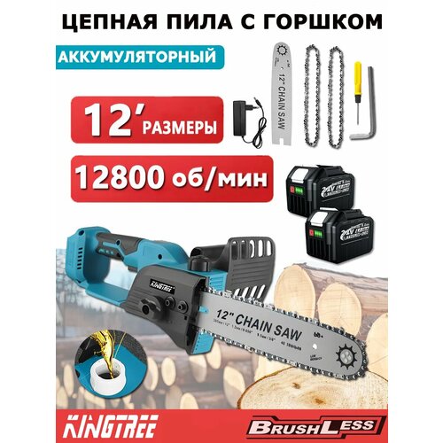Цепная пила KINGTREE, 12", Li-Ion, бесщеточный мотор, скорость 12800 об/мин,2 аккумулятора 9 Ач