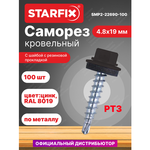 Саморез кровельный 4,8х19 мм цинк шайба с прокладкой PT3 RAL 8019 STARFIX 100 штук (SMP2-22690-100)