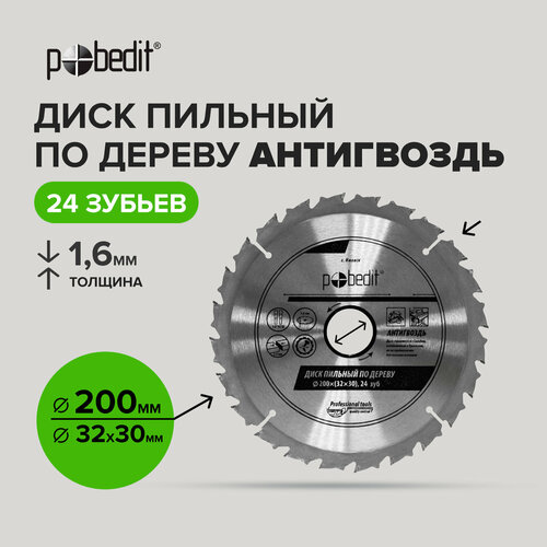 Диск пильный по дереву Антигвоздь 200 мм 24 зубьев, Pobedit