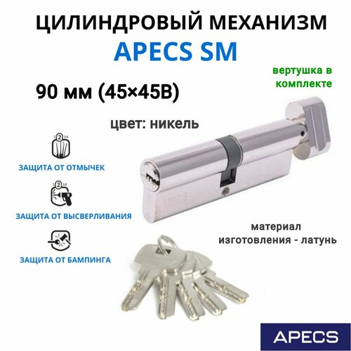 Цилиндровый механизм с вертушкой Apecs SM 90(45/45)C-NI, личинка для замка