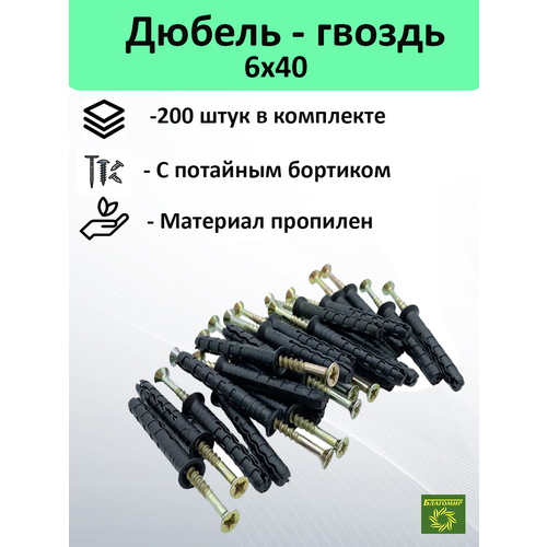Дюбель-гвоздь 6х40мм для крепления предметов, 200 штук.