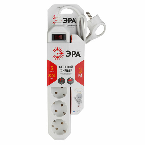 Сетевой фильтр «Эра» заземлением выключателем 3x0,75 мм2 5 гнезд, 1,5 м