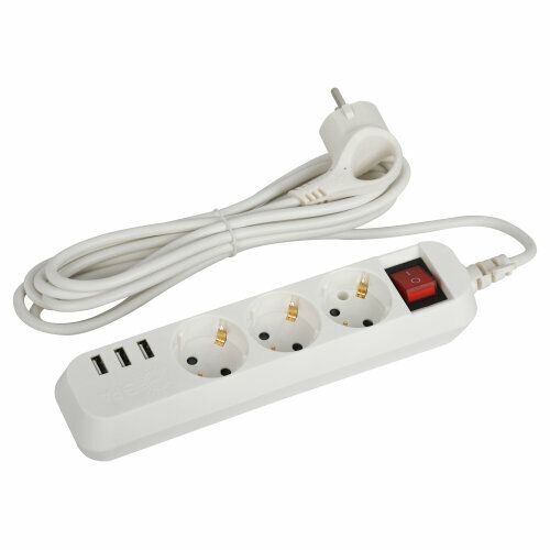 Удлинитель электрический ЭРА U-3es-3m-USB c заземлением с выключателем 3 розетки + 3xUSBA 3м 10А