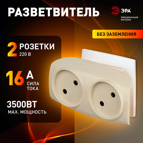 Тройник SP-2-I ЭРА / Тройник розетка электрический / Разветвитель без заземления, 2 розетки, плоский, 16А, слоновая кость