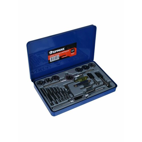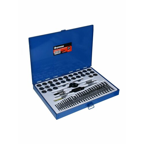 Набор плашек и метчиков ермак – это комплект из 40 предметов в жестком пластиковом кейсе. Плашки предназначены для нарезания наружных резьб различных размеров, а метчики – для нарезания внутренней резьбы. Широко применяются в промышленности, производстве, ремонте и в быту
