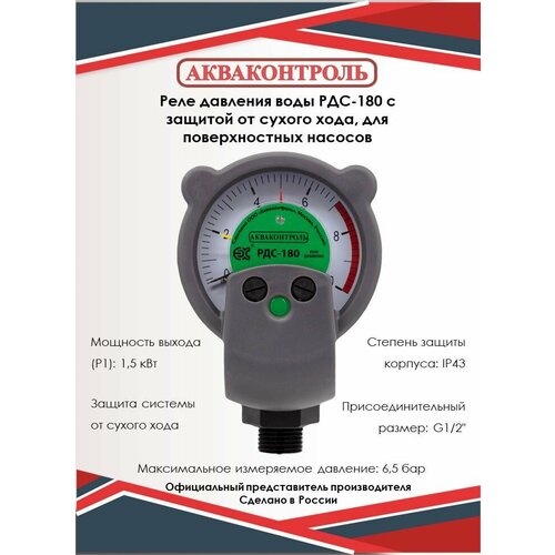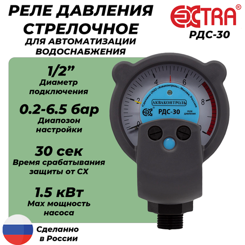 Реле давления воды Extra Акваконтроль РДС-180, стрелочное, c защитой от сухого хода, для поверхностных насосов / Подключение G1/2"
