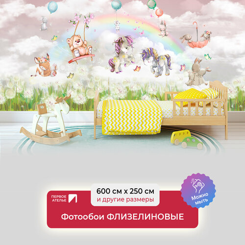 Фотообои детские на стену флизелиновые животные первое ателье "Зверята, единорожки и зайчата под радугой" 600х250 см (ШхВ), моющиеся, Premium