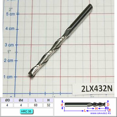 Фреза концевая спиральная 2 зуба торец Ø4х32 хвостовик Ø4х60 твердость HRC35