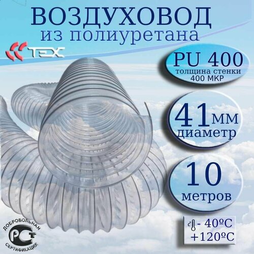 Полиуретановый гибкий воздуховод PU-400-41/10 армированный прозрачный шланг диаметр 41 мм, длина 10 метров. Гибкая гофра для аспирации и стружкоотсоса