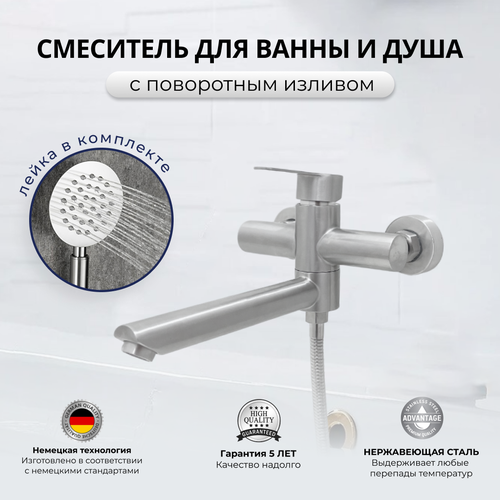Смеситель с поворотным изливом / Смеситель для ванны с душем / Смеситель в ванную с душем / Хром/ Нержавеющая сталь/ Смеситель для ванны