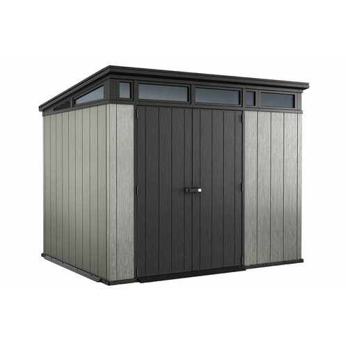 Практичный стильный домик для садового инвентаря Artisan 9x7. Простой фасад, плоская крыша, большие двустворчатые двери и интересно скомпонованные окна – отличительные черты этого продукта. Можно окрашивать панели! Особенности сарая: Домик изготовлен из высококачественного пластика DUOTEC