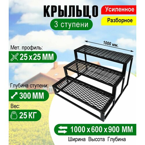 Крыльцо к дому 3 ступени - каркас с решеткой Усиленный. Ширина 1 метр.