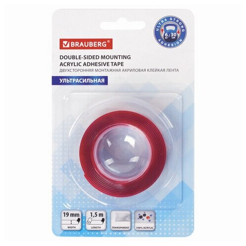 Монтажная прозрачная суперпрочная двухсторонняя лента 19 мм х 1.5 м, комплект 5 шт, акриловая, 1 мм, BRAUBERG, 606423