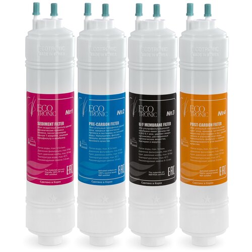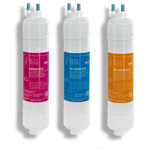 Комплект фильтров Ecotronic 12" с RO мембраной состоит из: из:Осадочный фильтр, удаляющий примеси размером больше 1 мкм и защищающий предфильтр и мембрану (поток: 4,5 л/мин)Угольный предфильтр, удаляющий хлор, органические примеси и пестициды; наполнитель фильтра: гранулы активированного угля высокого качества (поток: 4,5 л/мин)Обратноосмотическая мембрана - удаляет все известные примеси из воды с эффективностью 99,9%Угольный постфильтр для финальной доочистки воды и улучшения ее вкуса (поток: 4,5 л/мин)Особенности