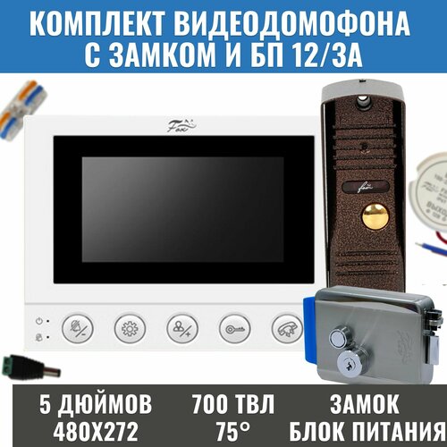 Комплект видеодомофона и вызывной панели Fox FX-VD5E-KIT Сапфир 4.3" для дома с электромеханическим замком и блоком питания 12/3А