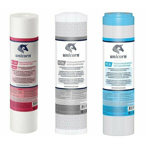 Комплект картриджей для тройной системы очистки воды Unicorn FPS-3. Включает в себя следующий картриджи:1. PS-10 (Картридж из пористого полипропилена 10"Картриджи данного типа изготовлены из полипропиленового волокна, которое не вступает в реакцию с химикатами и не разрушается под воздействием бактерий. Задерживают всякого рода механические загрязнения, такие как песок, ржавчина, ил.