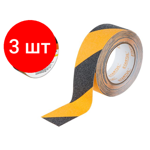 Комплект 3 штук, Лента противоскользящая клейкая 50ммх10м чернo-желтая STARTUL PROFI (ST9023-50-10)