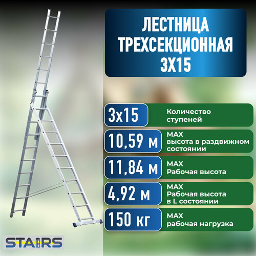 Лестница алюминиевая Stairs 3х15 (10.95 м), максимальная нагрузка 150 кг