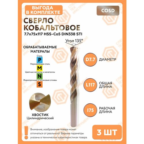 Сверло кобальтовое 7.7x75x117 HSS-Co5 DIN338 3 штуки "СпецТехИнструмент"