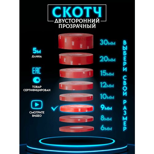 Двухсторонний скотч пеноакриловый для авто 3М 6008F 9 мм х 5 м (двухсторонний скотч, пеноакриловая клейкая лента двусторонняя, монтажная лента 3M)