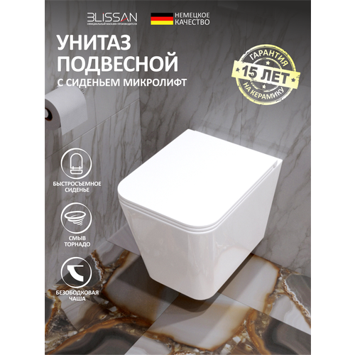 Унитаз подвесной безободковый BLISSAN Royal смыв скрытый Торнадо 3.0 с сиденьем микролифт быстросъемное