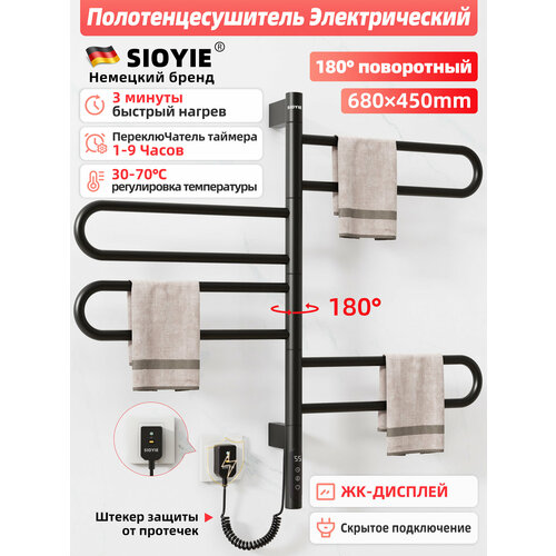 Полотенцесушитель электрический поворотный SIOYIE G65 430мм 780мм, нержавеющая сталь черный форма F-образная