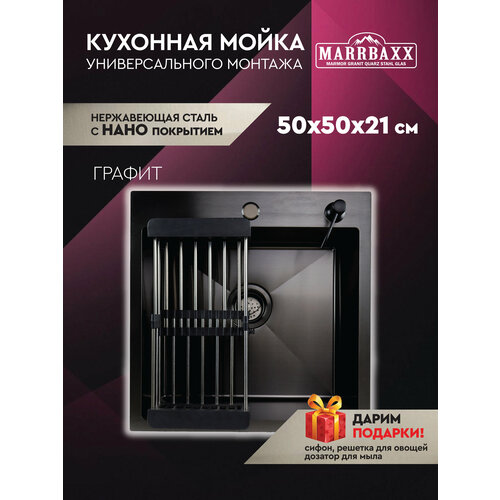 Мойка для кухни из нержавеющей стали 50 х 50, с сифоном и решеткой для овощей, "MARRBAXX", графитовая