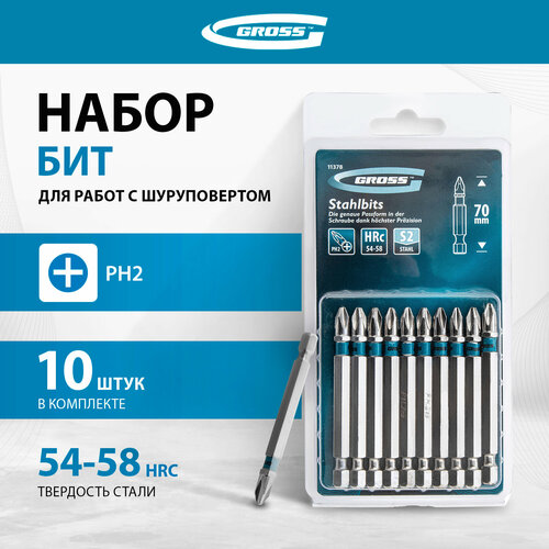 Набор бит торсионных Gross PH2x25 мм для ударных шуруповертов, 10 шт 11482