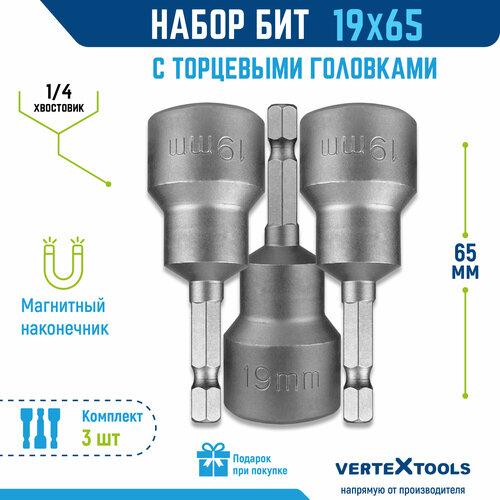 Биты с торцевыми магнитными головками 19x65, 3 шт.