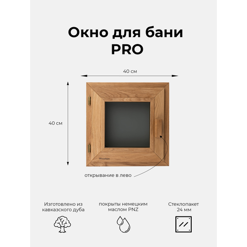 Деревянное окно Woodson Pro для бани и комнат отдыха из дуба, стеклопакет 24 мм цвета Gray, размеры окна 40х40 см
