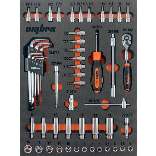 OMT131STE Набор головок торцевых 1/4", 1/2" DR с аксессуарами и вставками-битами в EVA ложементе 560х375 мм, 131 предмет. OMBRA