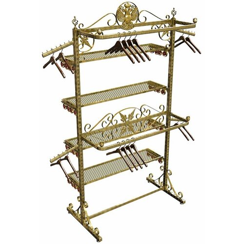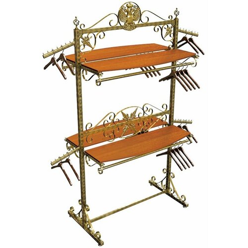 Орел» демонстрирует статусность, хороший вкус, элегантность. На изделии изображен двуглавый орел. Это символ государственности, мощи, силы, ведь такая птица - основа оформления российского герба. Подобный дизайн - свидетельство статуса, приверженности классике, высокого качества представленной в нем продукции. Гордая птица может свидетельствовать и о патриотизме, поэтому мебель актуальна для бутиков, торгующих элитными товарами отечественного производства. Система является отдельностоящей. Перфорация стойки выдерживает вес до 15 кг и позволяет перемещать полку или поручень по высоте с "шагом" равным 1,5 см. Цвет полок из ДСП Вы можете выбрать по своему желанию, исходя из представленных на сайте цветов ДСП (Белый с черной кромкой, Серый, Светлый бук, Вишня, Орех, Дуб Венге).