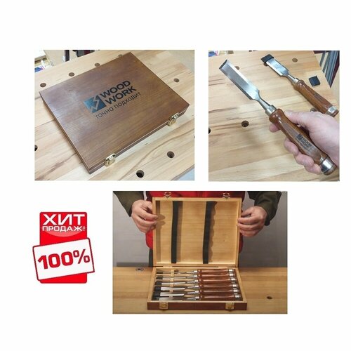 Набор стамесок WOODWORK CrV хромованадиевые, 6 штук, в деревянном кейсе, PTS-600