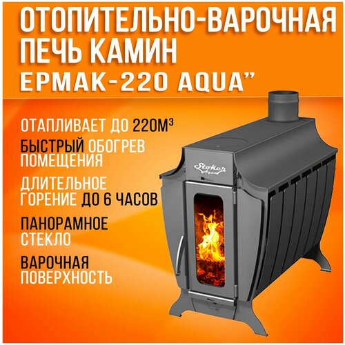 Отопительная печь дровяная длительного горения Ермак Stoker (Стокер) 220 Aqua-C со встроенным теплообменником, дверца со стеклом / Для дома