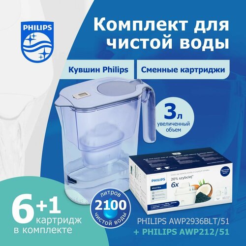 Комплект: кувшин Philips AWP2936BLT/51, 3 литра, цифровой таймер + сменные картриджи Philips AWP212/51, 6 шт