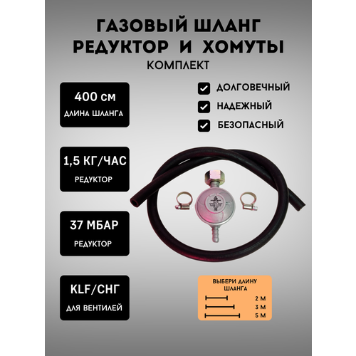 Газовый шланг Novogaz для баллона черный 4 метра и хомуты, комплект.