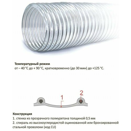 Полиуретановый гибкий воздуховод PU-400-125/10 армированный прозрачный шланг диаметр 125 мм, длина 10 метров. Гибкая гофра для аспирации и стружкоотсоса